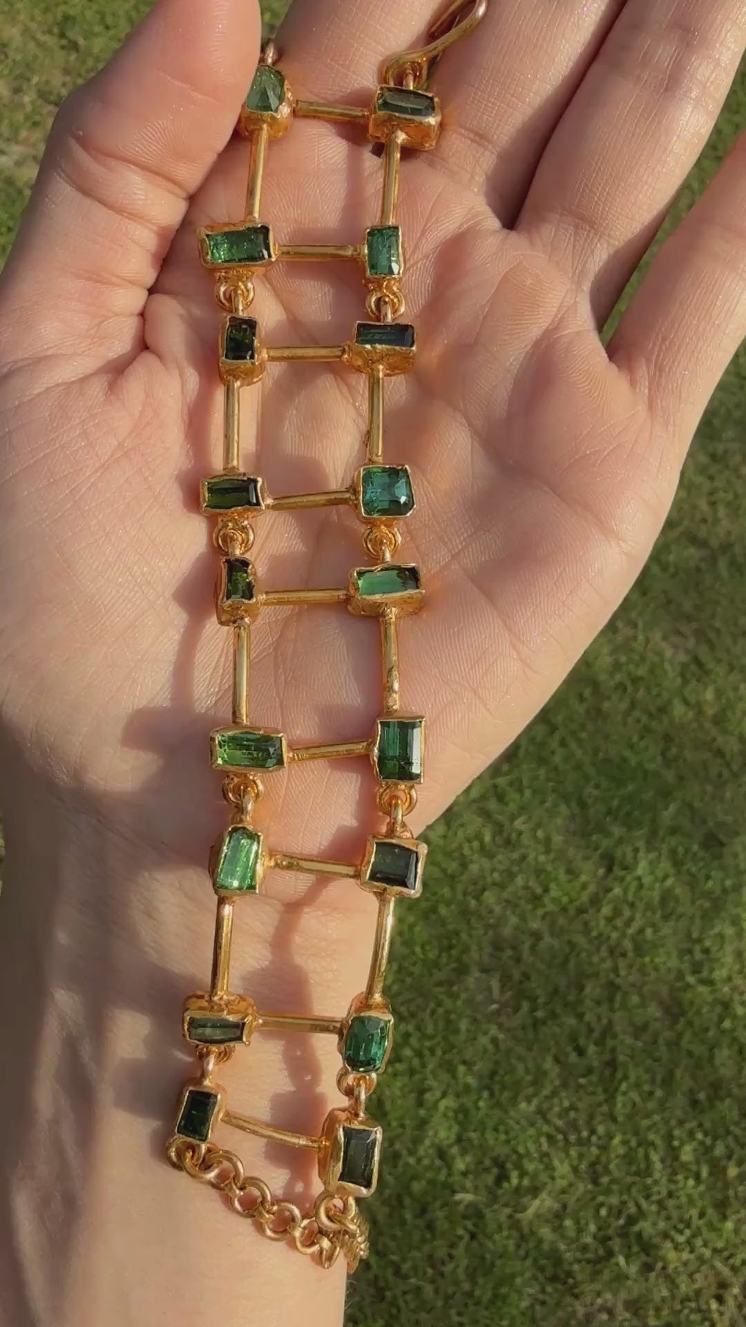 Lush and luminous, this Green Tourmaline Bracelet features vibrant green tourmaline gemstones set on a 24K gold-plated silver band. Known for its rich color and grounding energy, green tourmaline adds a natural elegance to any look. The warmth of gold enhances the gemstone’s earthy beauty, making this bracelet a refined statement—perfect for both everyday wear and special occasions.