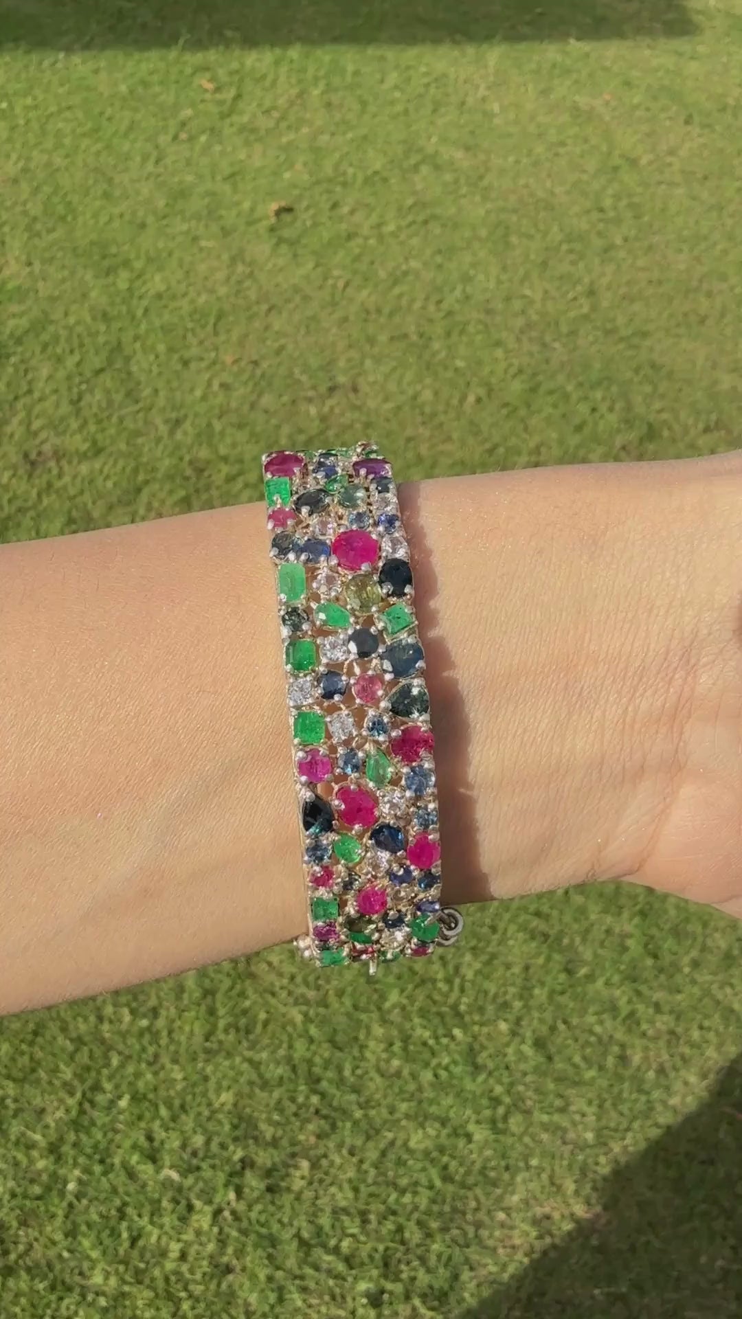 Rich in heritage and color, this Mixed Gemstone Bracelet features a stunning blend of emeralds and rubies sourced from the mountains of Afghanistan, artfully combined with vivid sapphire and sparkling white topaz. Set on a sleek silver bracelet, each gemstone tells its own story of origin and beauty. The harmonious mix of tones and textures creates a look that’s both timeless and vibrant—perfect for those who appreciate fine craftsmanship and natural elegance.